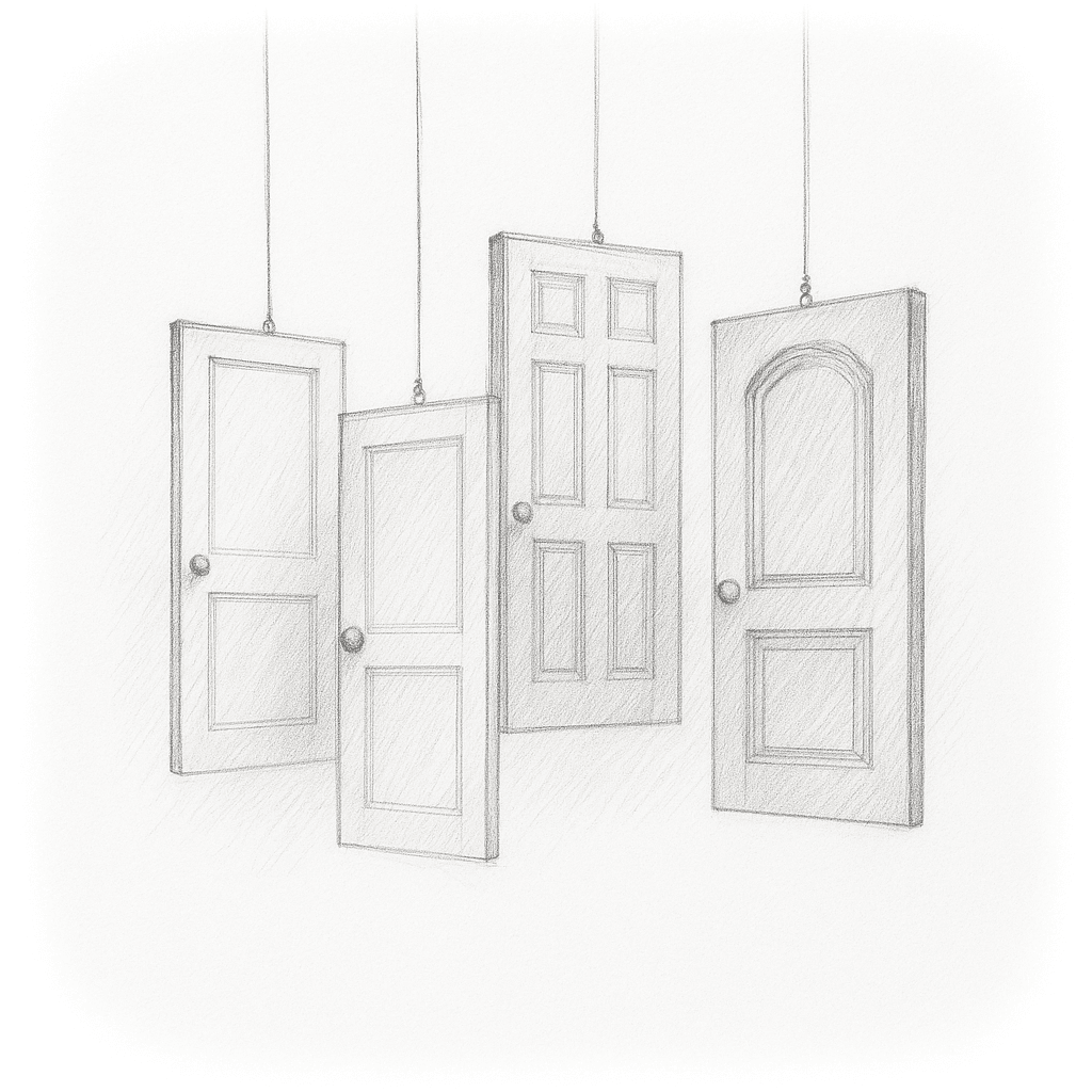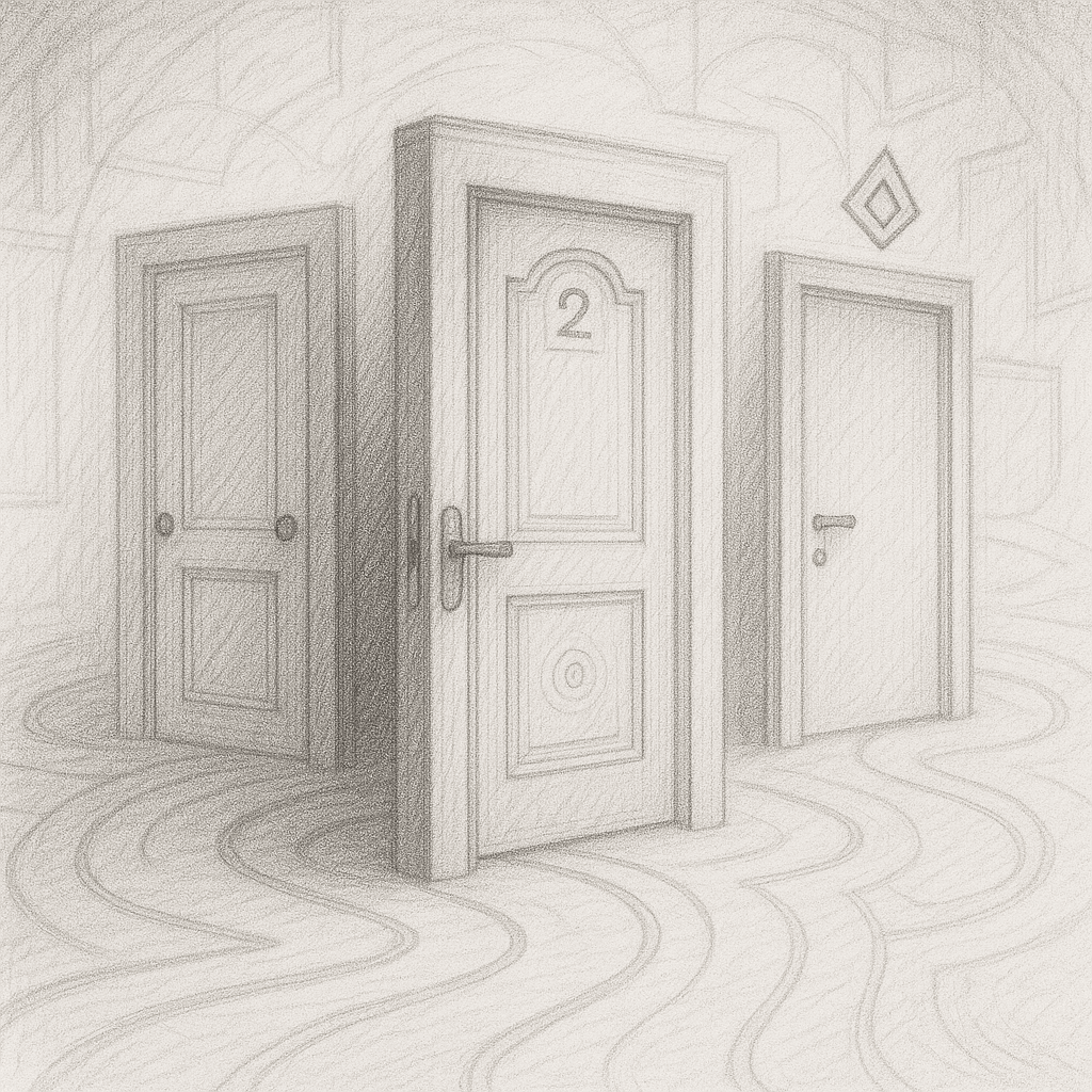 En illusion av val – tre dörrar, alla leder till samma plats. Ett ifrågasättande av vår upplevda frihet i konsumtionssamhället. Välkommen in i labyrinten, designad för att kännas valbar men i själva verket fullständigt regisserad.